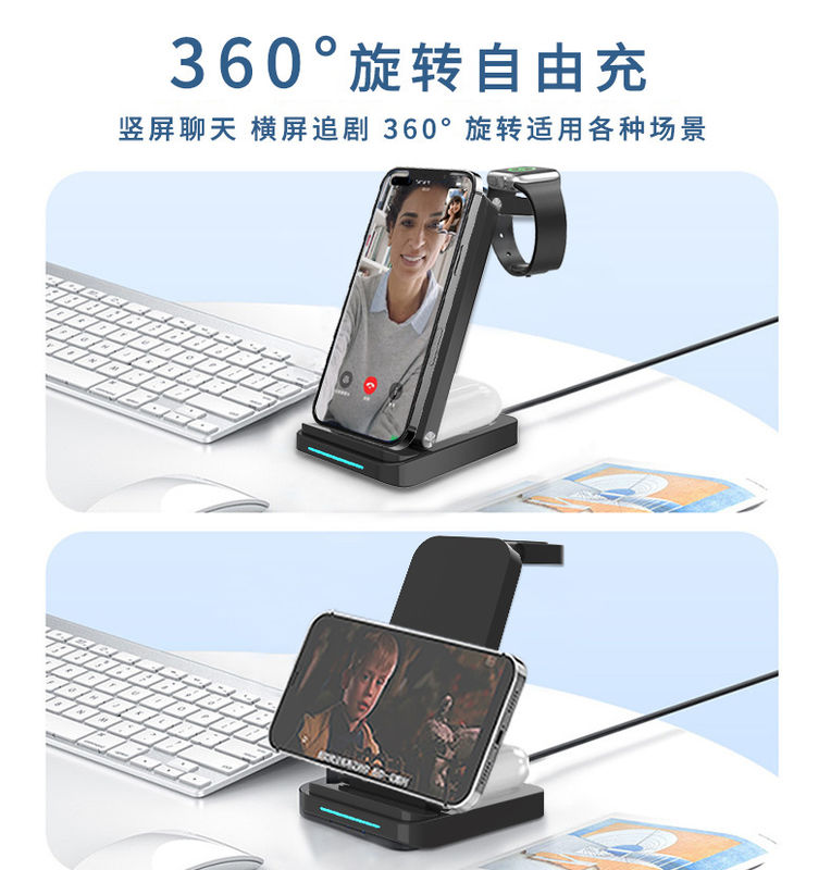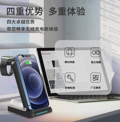 Pour résumer, ce chargeur sans fil 3-en-1, avec son design unique, son intégration multifonctionnelle, sa flexibilité pratique, sa sécurité et sa stabilité, ainsi que sa large compatibilité et d'autres caractéristiques, offre aux utilisateurs une expérience de charge efficace, pratique et sûre. Qu'il s'agisse d'un utilisateur individuel ou professionnel, vous pouvez obtenir une solution de charge qui répond à vos besoins.